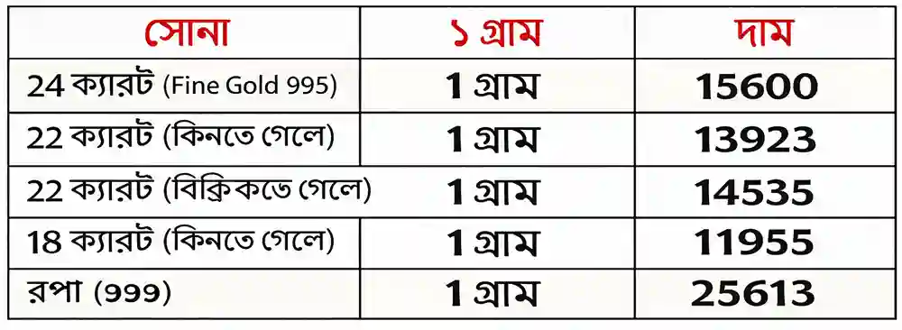 আজ সোনার দাম বদলে কত হল? ২২ ক্যারেট সোনার দাম ১৪৫৩৫ টাকা হয়েছে ৷ ১৮ ক্যারেটের দাম ১১৯৩৫ টাকা হয়েছে ৷ ১ কেজি রুপোর দাম হয়েছে ২৫৬২১৩ টাকা হয়েছে। সোনা ও রুপো কেনার সময়ে উপরে দেওয়া দামের সঙ্গে আরও ৩ শতাংশ GST যুক্ত হবে।