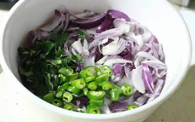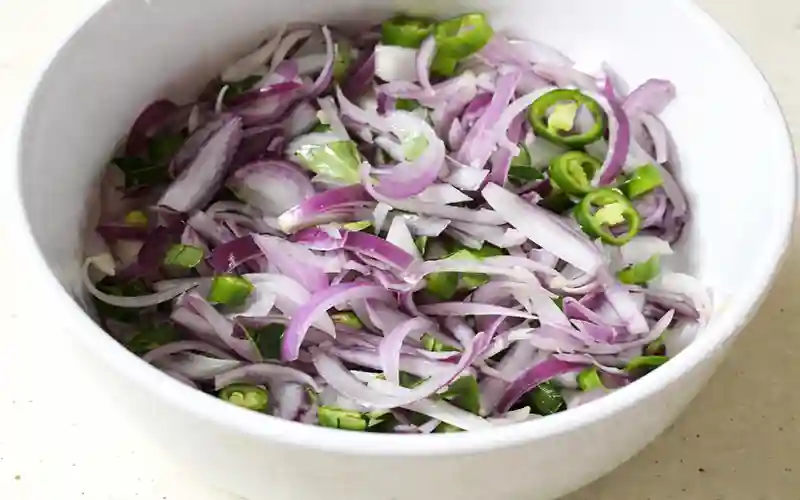 ১. পাতলা করে কাটানো পেঁয়াজ, আদা, মরিচ, পুদিনা ও লবণ একটি বাটিতে ভালো করে মিশিয়ে ৫–১০ মিনিট রেখে দিন।