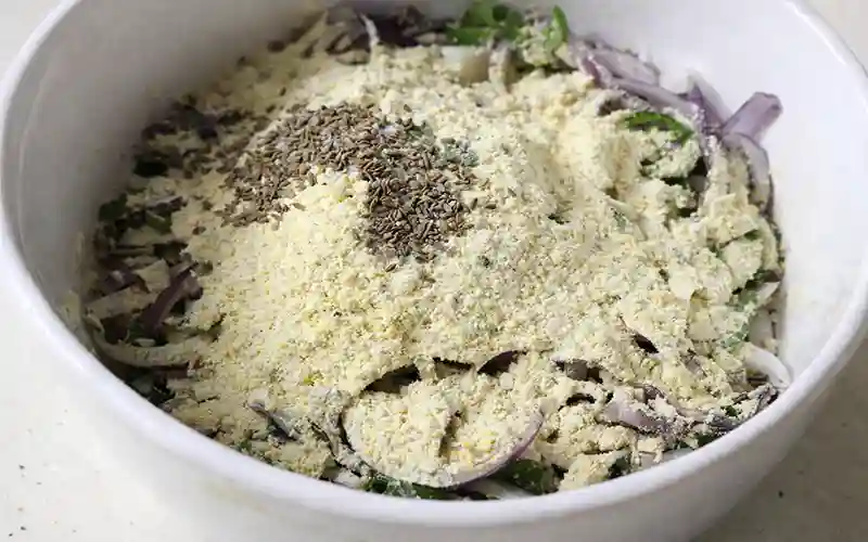 ২. মিশ্রণে হলুদের গুঁড়ো, বেসন, চালের আটা ও অজওয়াইন ছিটিয়ে আবার মিশান।