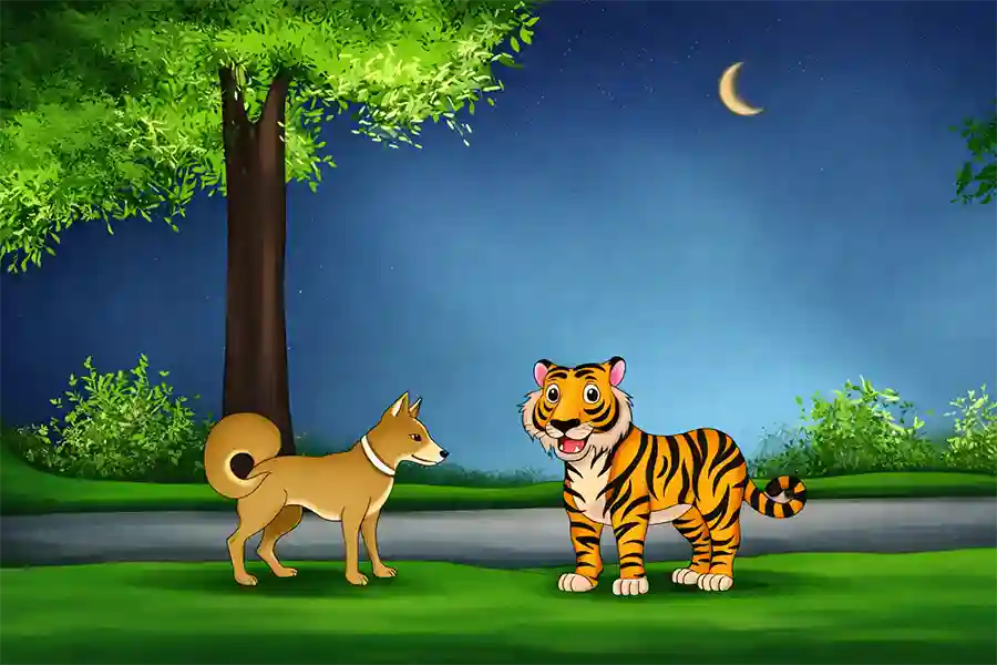 একদিন এক গেরস্থের পোষা কুকুরের সঙ্গে এক বাঘের দেখা হয়। দুদিন শিকার না পেয়ে অনাহারে বাঘ খুবই কাহিল হয়ে পড়েছিল। তাই হাঁটতেও কষ্ট হচ্ছিল তার।